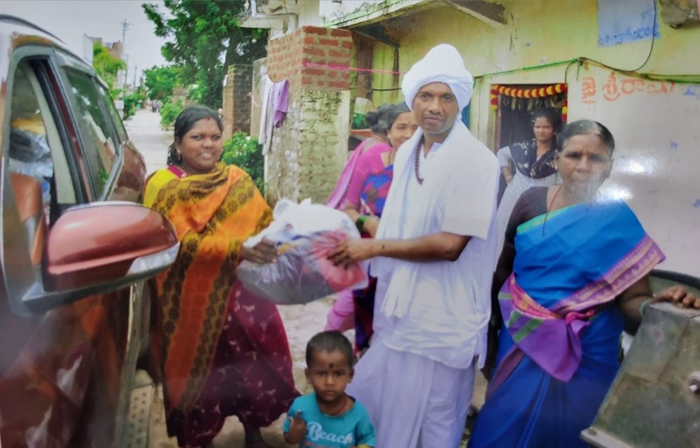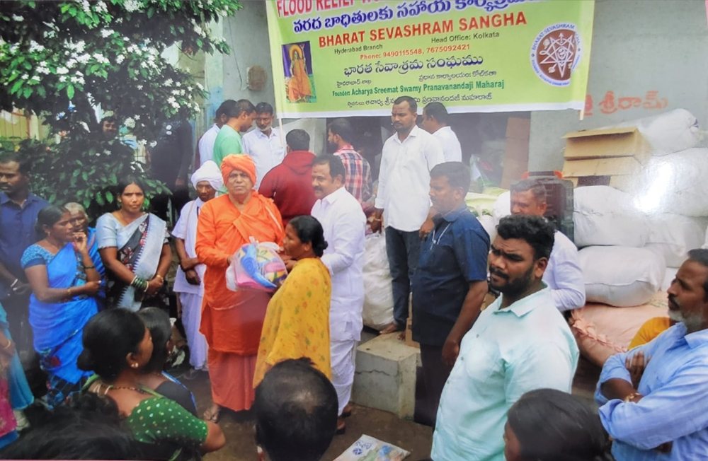 At the end of August there was intense rain in and around Telangana, various districts got flooded, causing damage to the road, crops, and houses. One such area is Kamareddy town and the district in Telangana. A rescue relief work team lead by Swami Muneeswarananadaji rushed to the affected area with 1100 kits comprising of Dhoti, Sharees, T-shirt, Blankets, and Bisuits which were distributed among 1100 families in the presence of the local MLA Shri Katipally Venkata Ramana Reddy Garu.